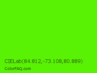 CIELab 84.812,-73.108,80.889 Color is a normal green color and the nearest color is Bright Green #66ff00. Hex code #59f205 and RGB value is rgb(89,242,5). In RGB color space, this color is composed of 35% red, 95% green, 2% blue, In CMYK color space, this color is composed of 63% cyan, 0% magenta, 98% yellow , 5% black , In HSL color space, this color has a hue angle of 99° , 96% saturation and 48% lightness.