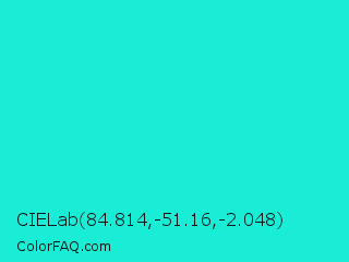 CIELab 84.814,-51.16,-2.048 Color is a normal cyan color and the nearest color is Bright Turquoise #08e8de. Hex code #1aedd6 and RGB value is rgb(26,237,214). In RGB color space, this color is composed of 10% red, 93% green, 84% blue, In CMYK color space, this color is composed of 89% cyan, 0% magenta, 10% yellow , 7% black , In HSL color space, this color has a hue angle of 173° , 85% saturation and 52% lightness.