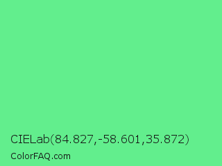 CIELab 84.827,-58.601,35.872 Color is a light green color and the nearest color is Very Light Malachite Green #64e986. Hex code #62ee8d and RGB value is rgb(98,238,141). In RGB color space, this color is composed of 38% red, 93% green, 55% blue, In CMYK color space, this color is composed of 59% cyan, 0% magenta, 41% yellow , 7% black , In HSL color space, this color has a hue angle of 138° , 80% saturation and 66% lightness.