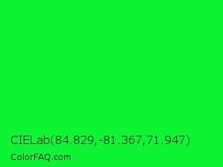 CIELab 84.829,-81.367,71.947 Color is a normal green color and the nearest color is Malachite #0bda51. Hex code #0ff536 and RGB value is rgb(15,245,54). In RGB color space, this color is composed of 6% red, 96% green, 21% blue, In CMYK color space, this color is composed of 94% cyan, 0% magenta, 78% yellow , 4% black , In HSL color space, this color has a hue angle of 130° , 92% saturation and 51% lightness.
