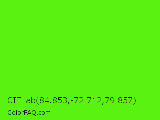 CIELab 84.853,-72.712,79.857 Color is a normal green color and the nearest color is Bright Green #66ff00. Hex code #5af211 and RGB value is rgb(90,242,17). In RGB color space, this color is composed of 35% red, 95% green, 7% blue, In CMYK color space, this color is composed of 63% cyan, 0% magenta, 93% yellow , 5% black , In HSL color space, this color has a hue angle of 101° , 90% saturation and 51% lightness.