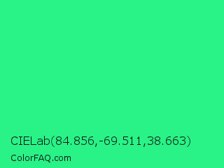 CIELab 84.856,-69.511,38.663 Color is a normal green color and the nearest color is Shamrock #33cc99. Hex code #29f287 and RGB value is rgb(41,242,135). In RGB color space, this color is composed of 16% red, 95% green, 53% blue, In CMYK color space, this color is composed of 83% cyan, 0% magenta, 44% yellow , 5% black , In HSL color space, this color has a hue angle of 148° , 89% saturation and 55% lightness.
