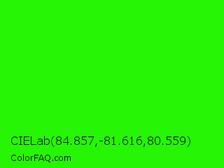 CIELab 84.857,-81.616,80.559 Color is a normal green color and the nearest color is Neon Green #39ff14. Hex code #26f505 and RGB value is rgb(38,245,5). In RGB color space, this color is composed of 15% red, 96% green, 2% blue, In CMYK color space, this color is composed of 84% cyan, 0% magenta, 98% yellow , 4% black , In HSL color space, this color has a hue angle of 112° , 96% saturation and 49% lightness.