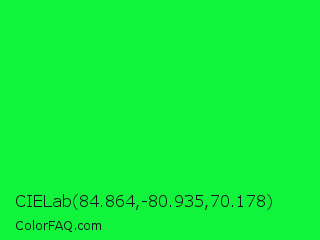CIELab 84.864,-80.935,70.178 Color is a normal green color and the nearest color is Malachite #0bda51. Hex code #10f53c and RGB value is rgb(16,245,60). In RGB color space, this color is composed of 6% red, 96% green, 24% blue, In CMYK color space, this color is composed of 93% cyan, 0% magenta, 76% yellow , 4% black , In HSL color space, this color has a hue angle of 132° , 92% saturation and 51% lightness.