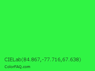 CIELab 84.867,-77.716,67.638 Color is a normal green color and the nearest color is Lime Green #32cd32. Hex code #30f444 and RGB value is rgb(48,244,68). In RGB color space, this color is composed of 19% red, 96% green, 27% blue, In CMYK color space, this color is composed of 80% cyan, 0% magenta, 72% yellow , 4% black , In HSL color space, this color has a hue angle of 126° , 90% saturation and 57% lightness.