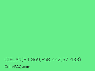 CIELab 84.869,-58.442,37.433 Color is a light green color and the nearest color is Very Light Malachite Green #64e986. Hex code #65ee8a and RGB value is rgb(101,238,138). In RGB color space, this color is composed of 40% red, 93% green, 54% blue, In CMYK color space, this color is composed of 58% cyan, 0% magenta, 42% yellow , 7% black , In HSL color space, this color has a hue angle of 136° , 80% saturation and 66% lightness.