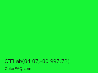 CIELab 84.87,-80.997,72 Color is a normal green color and the nearest color is Malachite #0bda51. Hex code #17f536 and RGB value is rgb(23,245,54). In RGB color space, this color is composed of 9% red, 96% green, 21% blue, In CMYK color space, this color is composed of 91% cyan, 0% magenta, 78% yellow , 4% black , In HSL color space, this color has a hue angle of 128° , 92% saturation and 53% lightness.