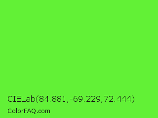 CIELab 84.881,-69.229,72.444 Color is a normal green color and the nearest color is Spring Frost #87ff2a. Hex code #62f136 and RGB value is rgb(98,241,54). In RGB color space, this color is composed of 38% red, 95% green, 21% blue, In CMYK color space, this color is composed of 59% cyan, 0% magenta, 78% yellow , 5% black , In HSL color space, this color has a hue angle of 106° , 87% saturation and 58% lightness.
