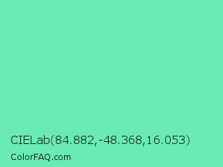 CIELab 84.882,-48.368,16.053 Color is a light green color and the nearest color is Medium Aquamarine #66ddaa. Hex code #6aebb4 and RGB value is rgb(106,235,180). In RGB color space, this color is composed of 42% red, 92% green, 71% blue, In CMYK color space, this color is composed of 55% cyan, 0% magenta, 23% yellow , 8% black , In HSL color space, this color has a hue angle of 154° , 76% saturation and 67% lightness.