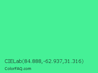 CIELab 84.888,-62.937,31.316 Color is a light green color and the nearest color is Eucalyptus #44d7a8. Hex code #45f096 and RGB value is rgb(69,240,150). In RGB color space, this color is composed of 27% red, 94% green, 59% blue, In CMYK color space, this color is composed of 71% cyan, 0% magenta, 38% yellow , 6% black , In HSL color space, this color has a hue angle of 148° , 85% saturation and 61% lightness.