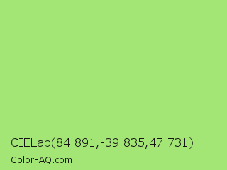 CIELab 84.891,-39.835,47.731 Color is a light green color and the nearest color is Feijoa #9fdd8c. Hex code #a4e676 and RGB value is rgb(164,230,118). In RGB color space, this color is composed of 64% red, 90% green, 46% blue, In CMYK color space, this color is composed of 29% cyan, 0% magenta, 49% yellow , 10% black , In HSL color space, this color has a hue angle of 95° , 69% saturation and 68% lightness.