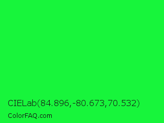 CIELab 84.896,-80.673,70.532 Color is a normal green color and the nearest color is Malachite #0bda51. Hex code #17f53b and RGB value is rgb(23,245,59). In RGB color space, this color is composed of 9% red, 96% green, 23% blue, In CMYK color space, this color is composed of 91% cyan, 0% magenta, 76% yellow , 4% black , In HSL color space, this color has a hue angle of 130° , 92% saturation and 53% lightness.