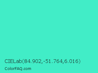 CIELab 84.902,-51.764,6.016 Color is a normal cyan color and the nearest color is Turquoise #40e0d0. Hex code #41edc7 and RGB value is rgb(65,237,199). In RGB color space, this color is composed of 25% red, 93% green, 78% blue, In CMYK color space, this color is composed of 73% cyan, 0% magenta, 16% yellow , 7% black , In HSL color space, this color has a hue angle of 167° , 83% saturation and 59% lightness.
