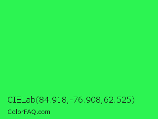 CIELab 84.918,-76.908,62.525 Color is a normal green color and the nearest color is Malachite #0bda51. Hex code #2cf452 and RGB value is rgb(44,244,82). In RGB color space, this color is composed of 17% red, 96% green, 32% blue, In CMYK color space, this color is composed of 82% cyan, 0% magenta, 66% yellow , 4% black , In HSL color space, this color has a hue angle of 131° , 90% saturation and 56% lightness.