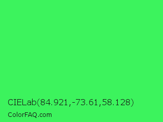 CIELab 84.921,-73.61,58.128 Color is a normal green color and the nearest color is UFO Green #3cd070. Hex code #3cf35d and RGB value is rgb(60,243,93). In RGB color space, this color is composed of 24% red, 95% green, 36% blue, In CMYK color space, this color is composed of 75% cyan, 0% magenta, 62% yellow , 5% black , In HSL color space, this color has a hue angle of 131° , 88% saturation and 59% lightness.