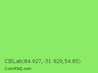 CIELab 84.927,-51.929,54.85 Color is a light green color and the nearest color is Pastel Green #77dd77. Hex code #8beb66 and RGB value is rgb(139,235,102). In RGB color space, this color is composed of 55% red, 92% green, 40% blue, In CMYK color space, this color is composed of 41% cyan, 0% magenta, 57% yellow , 8% black , In HSL color space, this color has a hue angle of 103° , 77% saturation and 66% lightness.