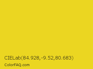 CIELab 84.928,-9.52,80.683 Color is a normal yellow color and the nearest color is Sunflower #e4d422. Hex code #ebd621 and RGB value is rgb(235,214,33). In RGB color space, this color is composed of 92% red, 84% green, 13% blue, In CMYK color space, this color is composed of 0% cyan, 9% magenta, 86% yellow , 8% black , In HSL color space, this color has a hue angle of 54° , 83% saturation and 53% lightness.