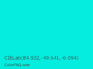 CIELab 84.932,-49.641,-6.094 Color is a normal cyan color and the nearest color is Bright Turquoise #08e8de. Hex code #05edde and RGB value is rgb(5,237,222). In RGB color space, this color is composed of 2% red, 93% green, 87% blue, In CMYK color space, this color is composed of 98% cyan, 0% magenta, 6% yellow , 7% black , In HSL color space, this color has a hue angle of 176° , 96% saturation and 47% lightness.