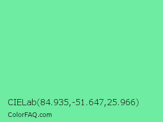 CIELab 84.935,-51.647,25.966 Color is a light green color and the nearest color is Medium Aquamarine #66ddaa. Hex code #6eeca1 and RGB value is rgb(110,236,161). In RGB color space, this color is composed of 43% red, 93% green, 63% blue, In CMYK color space, this color is composed of 53% cyan, 0% magenta, 32% yellow , 7% black , In HSL color space, this color has a hue angle of 144° , 77% saturation and 68% lightness.
