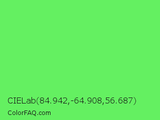 CIELab 84.942,-64.908,56.687 Color is a light green color and the nearest color is Screamin Green #66ff66. Hex code #64f061 and RGB value is rgb(100,240,97). In RGB color space, this color is composed of 39% red, 94% green, 38% blue, In CMYK color space, this color is composed of 58% cyan, 0% magenta, 60% yellow , 6% black , In HSL color space, this color has a hue angle of 119° , 83% saturation and 66% lightness.
