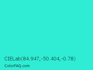 CIELab 84.947,-50.404,-0.78 Color is a normal cyan color and the nearest color is Turquoise #40e0d0. Hex code #2eedd4 and RGB value is rgb(46,237,212). In RGB color space, this color is composed of 18% red, 93% green, 83% blue, In CMYK color space, this color is composed of 81% cyan, 0% magenta, 11% yellow , 7% black , In HSL color space, this color has a hue angle of 172° , 84% saturation and 55% lightness.