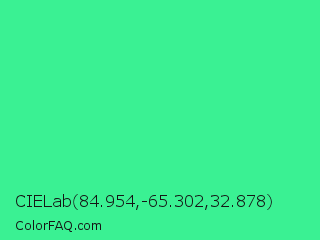 CIELab 84.954,-65.302,32.878 Color is a normal green color and the nearest color is Eucalyptus #44d7a8. Hex code #3af193 and RGB value is rgb(58,241,147). In RGB color space, this color is composed of 23% red, 95% green, 58% blue, In CMYK color space, this color is composed of 76% cyan, 0% magenta, 39% yellow , 5% black , In HSL color space, this color has a hue angle of 149° , 87% saturation and 59% lightness.