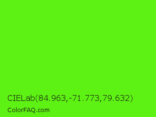 CIELab 84.963,-71.773,79.632 Color is a normal green color and the nearest color is Bright Green #66ff00. Hex code #5ef214 and RGB value is rgb(94,242,20). In RGB color space, this color is composed of 37% red, 95% green, 8% blue, In CMYK color space, this color is composed of 61% cyan, 0% magenta, 92% yellow , 5% black , In HSL color space, this color has a hue angle of 100° , 90% saturation and 51% lightness.