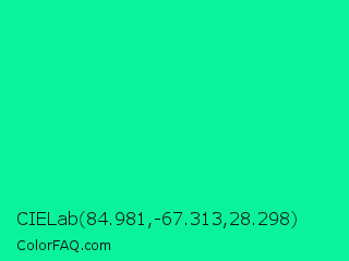 CIELab 84.981,-67.313,28.298 Color is a normal green color and the nearest color is Medium Spring Green #00fa9a. Hex code #0af29c and RGB value is rgb(10,242,156). In RGB color space, this color is composed of 4% red, 95% green, 61% blue, In CMYK color space, this color is composed of 96% cyan, 0% magenta, 36% yellow , 5% black , In HSL color space, this color has a hue angle of 158° , 92% saturation and 49% lightness.