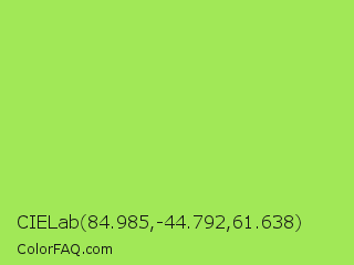CIELab 84.985,-44.792,61.638 Color is a light green color and the nearest color is Inchworm #b2ec5d. Hex code #a1e857 and RGB value is rgb(161,232,87). In RGB color space, this color is composed of 63% red, 91% green, 34% blue, In CMYK color space, this color is composed of 31% cyan, 0% magenta, 63% yellow , 9% black , In HSL color space, this color has a hue angle of 89° , 76% saturation and 63% lightness.