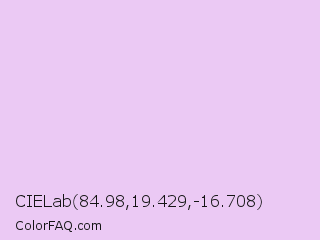 CIELab 84.98,19.429,-16.708 Color is a very light purple color and the nearest color is French Lilac #ecc7ee. Hex code #ebc9f4 and RGB value is rgb(235,201,244). In RGB color space, this color is composed of 92% red, 79% green, 96% blue, In CMYK color space, this color is composed of 4% cyan, 18% magenta, 0% yellow , 4% black , In HSL color space, this color has a hue angle of 287° , 66% saturation and 87% lightness.
