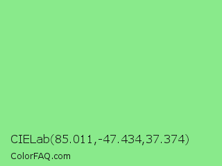 CIELab 85.011,-47.434,37.374 Color is a light green color and the nearest color is Light Green #90ee90. Hex code #89ea8b and RGB value is rgb(137,234,139). In RGB color space, this color is composed of 54% red, 92% green, 55% blue, In CMYK color space, this color is composed of 41% cyan, 0% magenta, 41% yellow , 8% black , In HSL color space, this color has a hue angle of 121° , 70% saturation and 73% lightness.