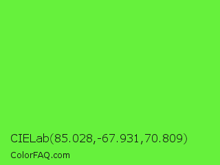 CIELab 85.028,-67.931,70.809 Color is a normal green color and the nearest color is Spring Frost #87ff2a. Hex code #66f13c and RGB value is rgb(102,241,60). In RGB color space, this color is composed of 40% red, 95% green, 24% blue, In CMYK color space, this color is composed of 58% cyan, 0% magenta, 75% yellow , 5% black , In HSL color space, this color has a hue angle of 106° , 87% saturation and 59% lightness.