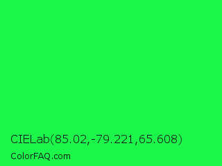 CIELab 85.02,-79.221,65.608 Color is a normal green color and the nearest color is Malachite #0bda51. Hex code #1cf54a and RGB value is rgb(28,245,74). In RGB color space, this color is composed of 11% red, 96% green, 29% blue, In CMYK color space, this color is composed of 89% cyan, 0% magenta, 70% yellow , 4% black , In HSL color space, this color has a hue angle of 133° , 92% saturation and 54% lightness.