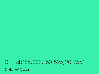 CIELab 85.033,-60.525,20.755 Color is a normal green color and the nearest color is Eucalyptus #44d7a8. Hex code #37f0ab and RGB value is rgb(55,240,171). In RGB color space, this color is composed of 22% red, 94% green, 67% blue, In CMYK color space, this color is composed of 77% cyan, 0% magenta, 29% yellow , 6% black , In HSL color space, this color has a hue angle of 158° , 86% saturation and 58% lightness.