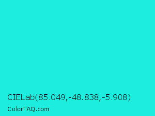 CIELab 85.049,-48.838,-5.908 Color is a normal cyan color and the nearest color is Bright Turquoise #08e8de. Hex code #1dedde and RGB value is rgb(29,237,222). In RGB color space, this color is composed of 11% red, 93% green, 87% blue, In CMYK color space, this color is composed of 88% cyan, 0% magenta, 6% yellow , 7% black , In HSL color space, this color has a hue angle of 176° , 85% saturation and 52% lightness.