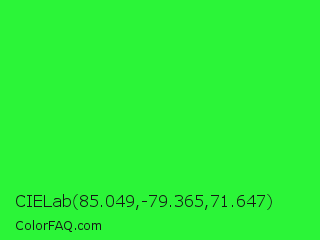 CIELab 85.049,-79.365,71.647 Color is a normal green color and the nearest color is Neon Green #39ff14. Hex code #2bf538 and RGB value is rgb(43,245,56). In RGB color space, this color is composed of 17% red, 96% green, 22% blue, In CMYK color space, this color is composed of 82% cyan, 0% magenta, 77% yellow , 4% black , In HSL color space, this color has a hue angle of 124° , 91% saturation and 56% lightness.