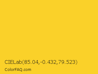 CIELab 85.04,-0.432,79.523 Color is a normal yellow color and the nearest color is Golden Dream #f0d52d. Hex code #fad129 and RGB value is rgb(250,209,41). In RGB color space, this color is composed of 98% red, 82% green, 16% blue, In CMYK color space, this color is composed of 0% cyan, 16% magenta, 84% yellow , 2% black , In HSL color space, this color has a hue angle of 48° , 95% saturation and 57% lightness.