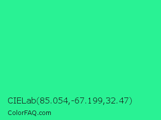 CIELab 85.054,-67.199,32.47 Color is a normal green color and the nearest color is Shamrock #33cc99. Hex code #29f294 and RGB value is rgb(41,242,148). In RGB color space, this color is composed of 16% red, 95% green, 58% blue, In CMYK color space, this color is composed of 83% cyan, 0% magenta, 39% yellow , 5% black , In HSL color space, this color has a hue angle of 152° , 89% saturation and 55% lightness.