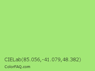CIELab 85.056,-41.079,48.382 Color is a light green color and the nearest color is Feijoa #9fdd8c. Hex code #a2e775 and RGB value is rgb(162,231,117). In RGB color space, this color is composed of 64% red, 91% green, 46% blue, In CMYK color space, this color is composed of 30% cyan, 0% magenta, 49% yellow , 9% black , In HSL color space, this color has a hue angle of 96° , 70% saturation and 68% lightness.