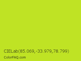 CIELab 85.069,-33.979,78.799 Color is a normal lime color and the nearest color is Las Palmas #c6e610. Hex code #bfe324 and RGB value is rgb(191,227,36). In RGB color space, this color is composed of 75% red, 89% green, 14% blue, In CMYK color space, this color is composed of 16% cyan, 0% magenta, 84% yellow , 11% black , In HSL color space, this color has a hue angle of 71° , 77% saturation and 52% lightness.