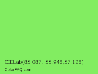 CIELab 85.087,-55.948,57.128 Color is a light green color and the nearest color is Pastel Green #77dd77. Hex code #82ed61 and RGB value is rgb(130,237,97). In RGB color space, this color is composed of 51% red, 93% green, 38% blue, In CMYK color space, this color is composed of 45% cyan, 0% magenta, 59% yellow , 7% black , In HSL color space, this color has a hue angle of 106° , 80% saturation and 65% lightness.
