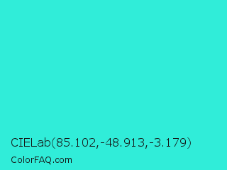 CIELab 85.102,-48.913,-3.179 Color is a normal cyan color and the nearest color is Turquoise #40e0d0. Hex code #30edd9 and RGB value is rgb(48,237,217). In RGB color space, this color is composed of 19% red, 93% green, 85% blue, In CMYK color space, this color is composed of 80% cyan, 0% magenta, 8% yellow , 7% black , In HSL color space, this color has a hue angle of 174° , 84% saturation and 56% lightness.
