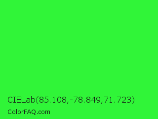 CIELab 85.108,-78.849,71.723 Color is a normal green color and the nearest color is Neon Green #39ff14. Hex code #30f538 and RGB value is rgb(48,245,56). In RGB color space, this color is composed of 19% red, 96% green, 22% blue, In CMYK color space, this color is composed of 80% cyan, 0% magenta, 77% yellow , 4% black , In HSL color space, this color has a hue angle of 122° , 91% saturation and 57% lightness.