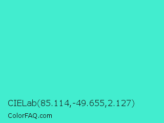 CIELab 85.114,-49.655,2.127 Color is a normal cyan color and the nearest color is Turquoise #40e0d0. Hex code #42edcf and RGB value is rgb(66,237,207). In RGB color space, this color is composed of 26% red, 93% green, 81% blue, In CMYK color space, this color is composed of 72% cyan, 0% magenta, 13% yellow , 7% black , In HSL color space, this color has a hue angle of 169° , 83% saturation and 59% lightness.