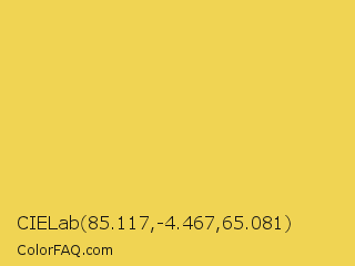 CIELab 85.117,-4.467,65.081 Color is a light yellow color and the nearest color is Confetti #e9d75a. Hex code #f0d453 and RGB value is rgb(240,212,83). In RGB color space, this color is composed of 94% red, 83% green, 33% blue, In CMYK color space, this color is composed of 0% cyan, 12% magenta, 65% yellow , 6% black , In HSL color space, this color has a hue angle of 49° , 84% saturation and 63% lightness.
