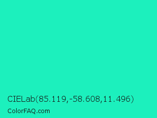 CIELab 85.119,-58.608,11.496 Color is a normal cyan color and the nearest color is Turquoise PWG #30d5c8. Hex code #1cf0bd and RGB value is rgb(28,240,189). In RGB color space, this color is composed of 11% red, 94% green, 74% blue, In CMYK color space, this color is composed of 88% cyan, 0% magenta, 21% yellow , 6% black , In HSL color space, this color has a hue angle of 166° , 88% saturation and 53% lightness.
