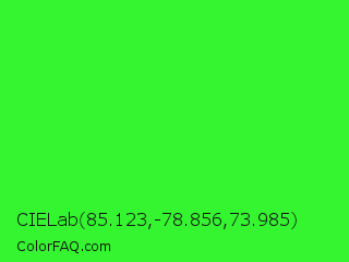 CIELab 85.123,-78.856,73.985 Color is a normal green color and the nearest color is Neon Green #39ff14. Hex code #34f530 and RGB value is rgb(52,245,48). In RGB color space, this color is composed of 20% red, 96% green, 19% blue, In CMYK color space, this color is composed of 79% cyan, 0% magenta, 80% yellow , 4% black , In HSL color space, this color has a hue angle of 119° , 91% saturation and 57% lightness.
