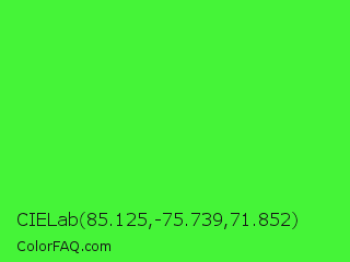 CIELab 85.125,-75.739,71.852 Color is a normal green color and the nearest color is Neon Green #39ff14. Hex code #45f438 and RGB value is rgb(69,244,56). In RGB color space, this color is composed of 27% red, 96% green, 22% blue, In CMYK color space, this color is composed of 72% cyan, 0% magenta, 77% yellow , 4% black , In HSL color space, this color has a hue angle of 116° , 90% saturation and 59% lightness.