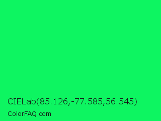 CIELab 85.126,-77.585,56.545 Color is a normal green color and the nearest color is Malachite #0bda51. Hex code #0df561 and RGB value is rgb(13,245,97). In RGB color space, this color is composed of 5% red, 96% green, 38% blue, In CMYK color space, this color is composed of 95% cyan, 0% magenta, 60% yellow , 4% black , In HSL color space, this color has a hue angle of 142° , 92% saturation and 51% lightness.