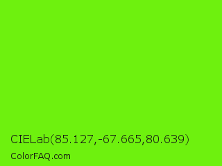 CIELab 85.127,-67.665,80.639 Color is a normal green color and the nearest color is Bright Green #66ff00. Hex code #6ef10e and RGB value is rgb(110,241,14). In RGB color space, this color is composed of 43% red, 95% green, 5% blue, In CMYK color space, this color is composed of 54% cyan, 0% magenta, 94% yellow , 5% black , In HSL color space, this color has a hue angle of 95° , 89% saturation and 50% lightness.